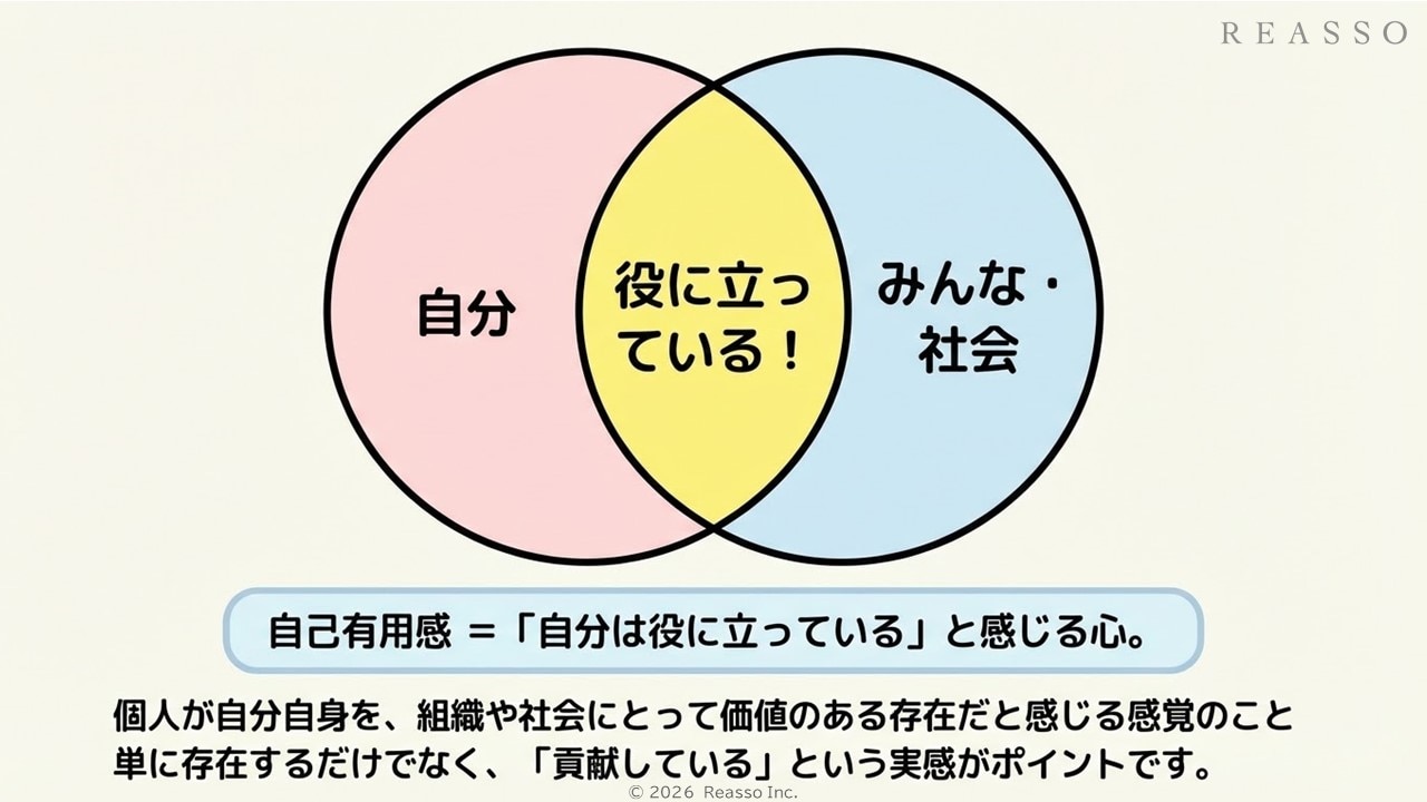 自己有用感とは、個人が自分自身を組織や社会にとって価値のある存在だと感じる感覚のことを指します。これは、自分が果たしている役割やその成果に対して肯定的な自己評価を持つことを意味します。自己有用感は、職場や社会における自己の貢献を実感するための重要な心理的要素であり、従業員のモチベーションやパフォーマンスに直接影響を与えます。