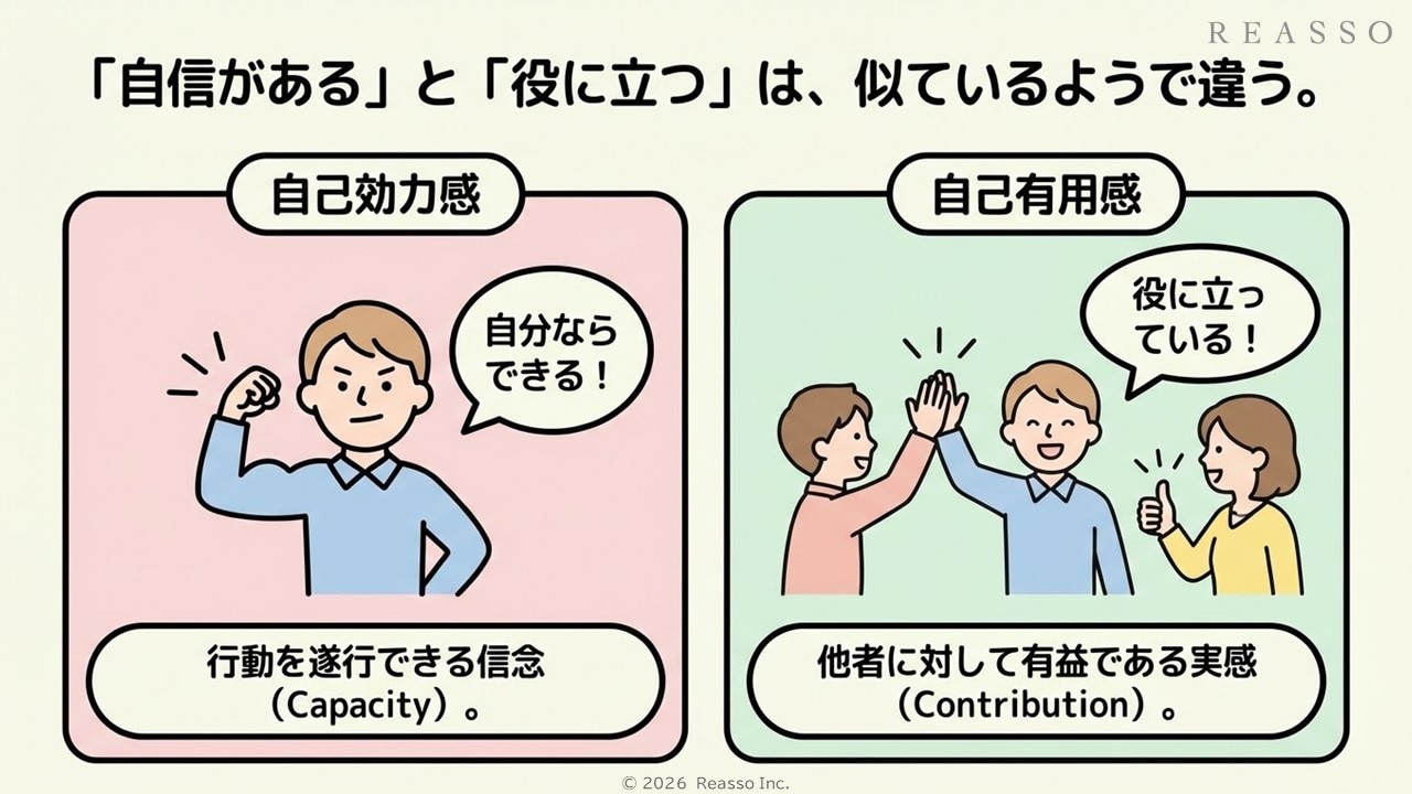 自己有用感は、自己効力感(セルフエフィカシー)とも密接に関連していますが、両者は異なる概念です。自己効力感は、特定の行動やタスクを成功裏に遂行できるという信念を指すのに対し、自己有用感はその行動やタスクが他者に対して有益であるという感覚を指します。つまり、自己効力感が「できる」という信念であるのに対し、自己有用感は「役に立っている」という実感に焦点を当てています。