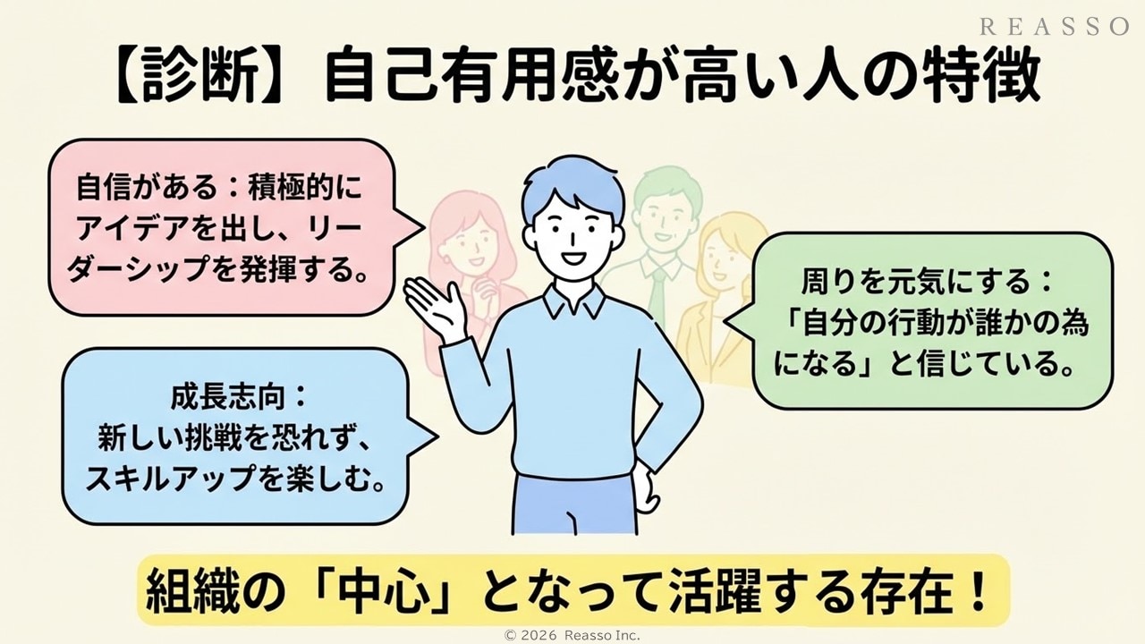 自己有用感が高い人は、自分の役割に対して強い自信を持っています。この自信は、日々の業務において積極的にアイデアを提案し、リーダーシップを発揮する行動に現れます。また、問題解決の場面でも冷静に対応し、自分のスキルや知識がチームに貢献できると信じています。