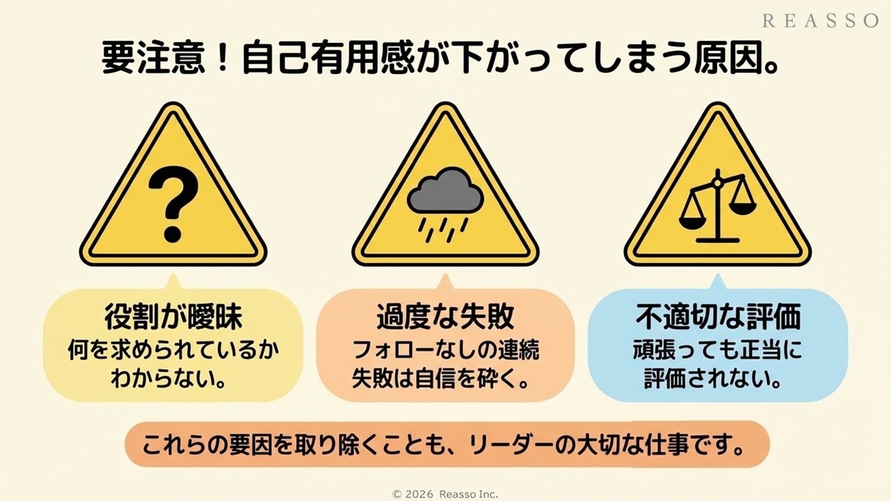 連続的な失敗やフィードバックの欠如は、自己有用感を著しく低下させる要因となります。従業員が失敗を繰り返すと、自分は役に立たない存在だと感じるようになり、自己有用感が低下します。このため、失敗から学びを得られるような支援やフィードバックを提供することが重要です。