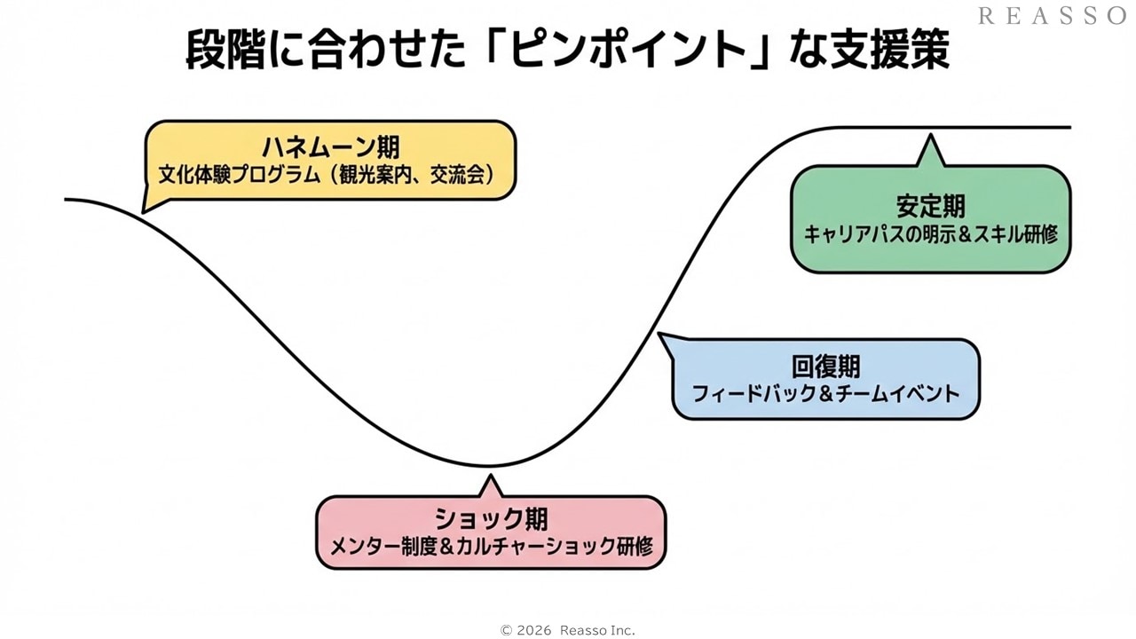 初期のポジティブな感情を利用して、外国人社員が日本文化や職場文化に早期に馴染むようサポートします。