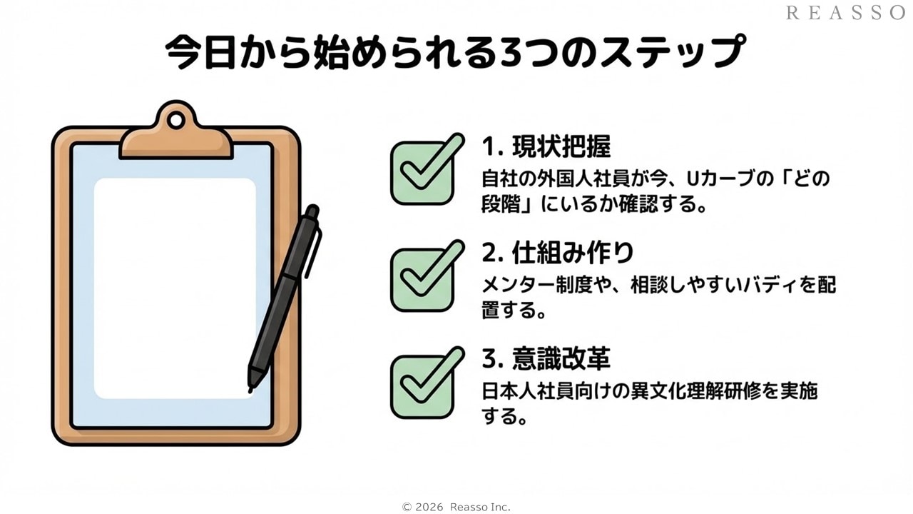 この記事では、異文化適応のUカーブ理論を活用して、外国人社員が直面する課題を解決するための具体的な方法を解説しました。重要なポイントとして以下を挙げます。