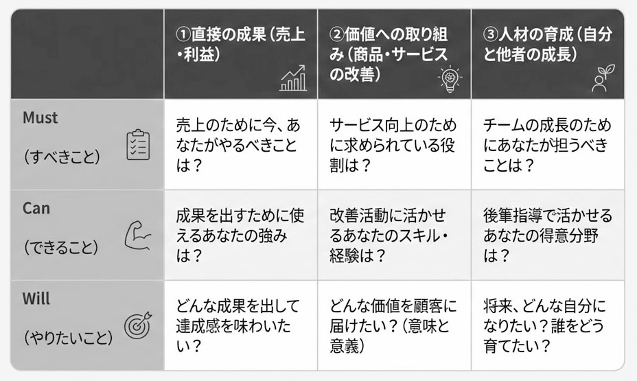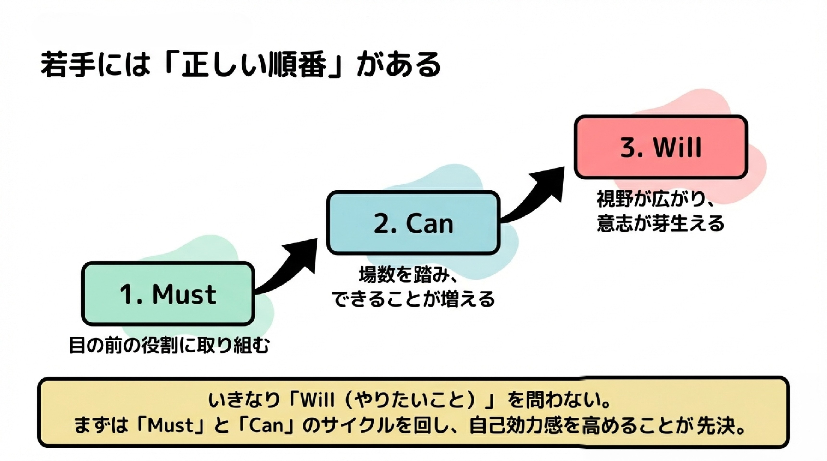 一般的に「Will(やりたいこと)」から始める重要性も説かれますが、実務経験の浅い段階では、まず「Must → Can」のサイクルを回し、「自分にはできることがある」という自己効力感を高めることが、結果的に強いWillを生み出す土台となります。