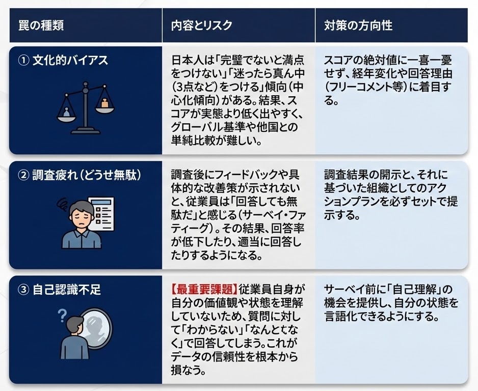 エンゲージメントサーベイを実施する際、出てきた数字を鵜呑みにしてはいけません。データの精度を下げる要因として以下の3点が挙げられます。