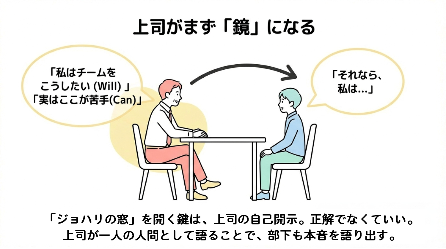 部下に「君のWillは?」と問う前に、上司が「私はチームをこうしたいと思っている(Will)」「私は実はここが苦手だが、ここなら貢献できる(Can)」と自己開示するのです。これは正解である必要はなく、あくまで「一人の見解」で構いません。