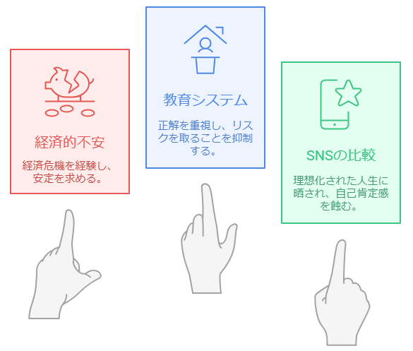 彼らの行動を理解するには、まず彼らの精神構造を形成した「るつぼ」を知る必要があります。彼らの強いリスク回避志向は、主に3つの環境要因が掛け合わさった「不安の三位一体」によって形成されています