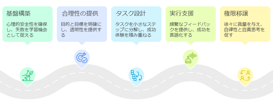 最も重要なのが、彼らが達成した「小さな成功」をマネージャーが具体的に言語化することです。「先週よりこの部分が早くなった」「この分析の視点は論理的で正しい」と伝えることで、彼ら自身が「自分は成長できている」と認識でき、自己効力感が強化されます。